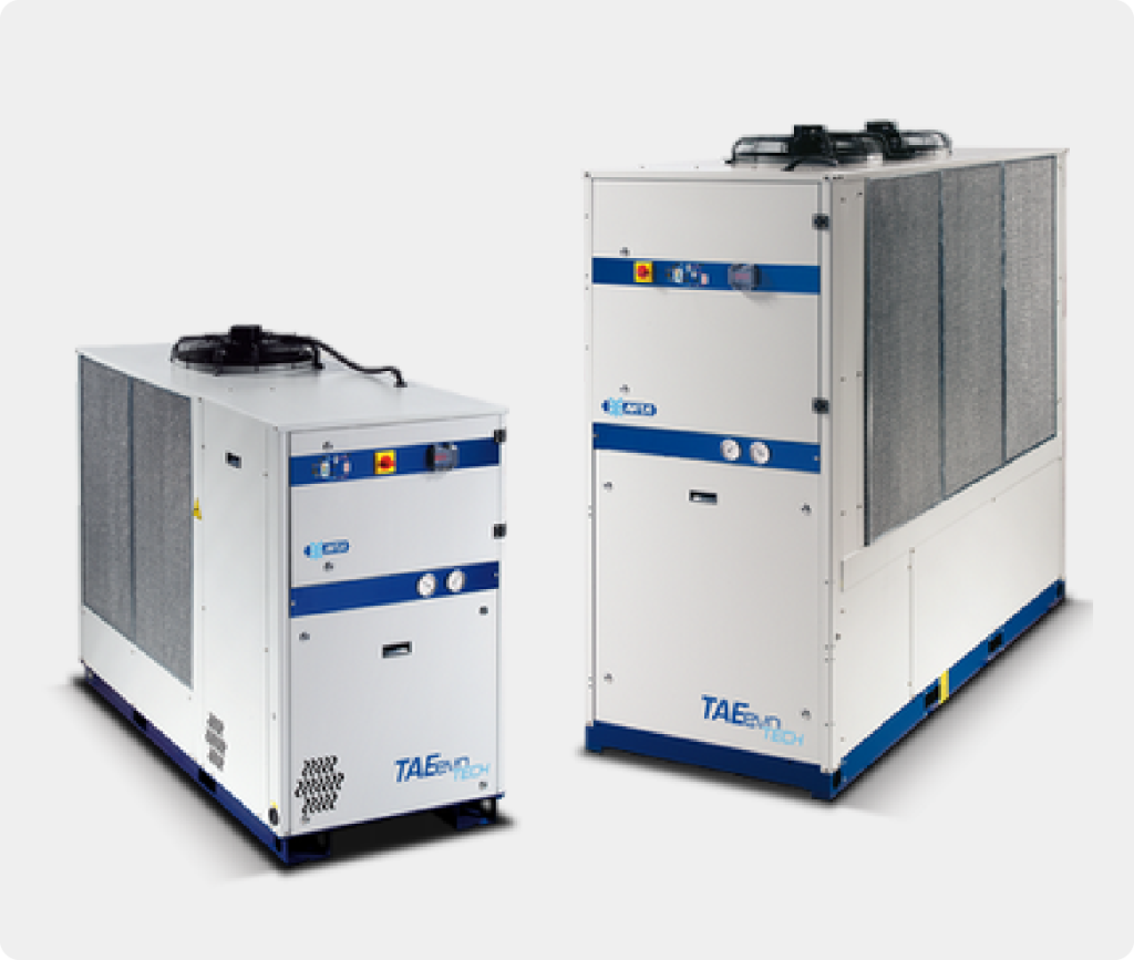 The TAEevo TECH chillers are compact units designed for industrial use, equipped with hermetic scroll compressors and featuring an innovative finned pack evaporator installed within the hydraulic storage tank.